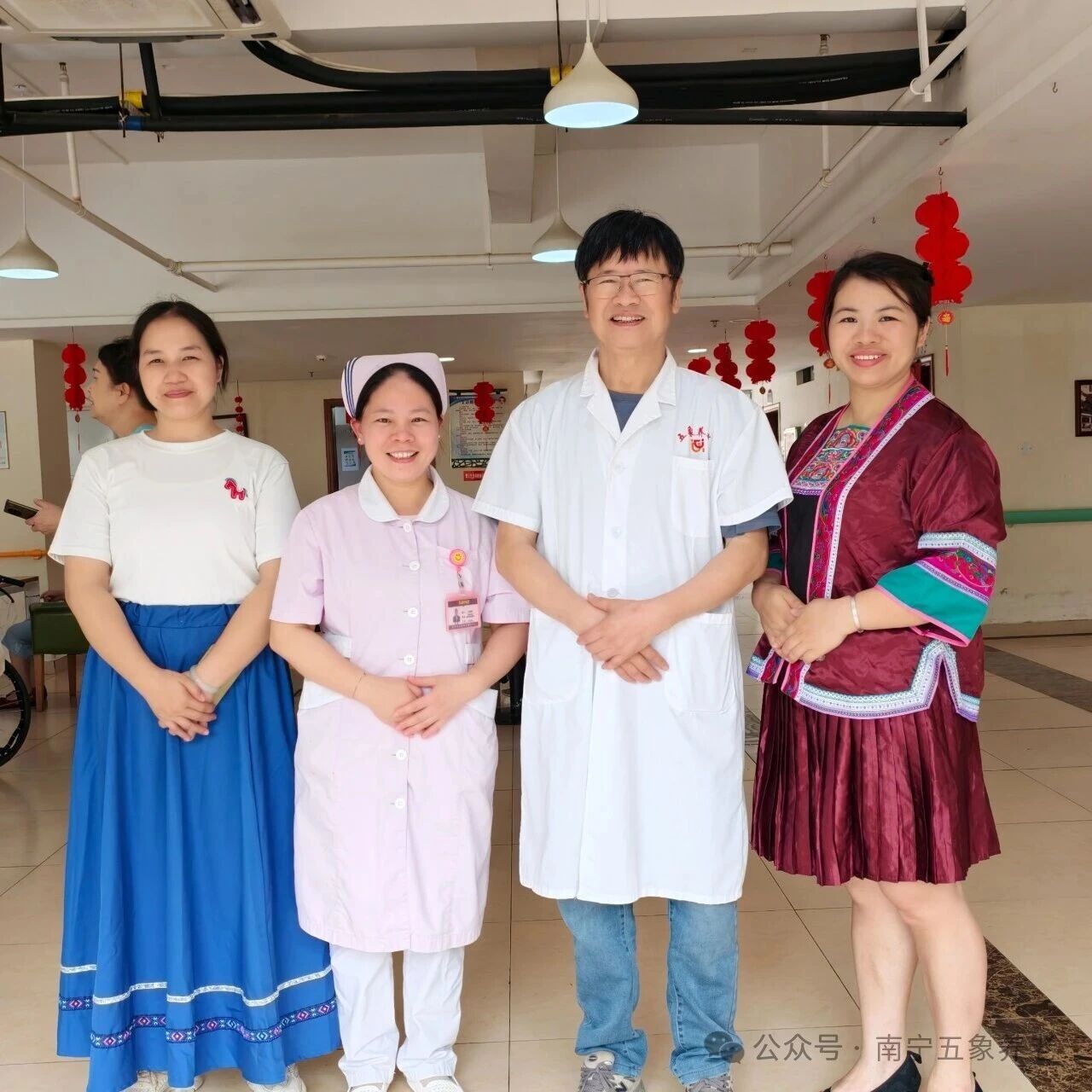 为了让节日氛围更浓,护士长们特意换上了民族服装。红、蓝、紫、绿,各色壮族服饰一亮相,顿时又增添了几分节日的氛围。庞声航主任笑着说:“穿上民族服装,大家更有过节的样子了。今天天气好,活动丰富,希望各位长者们玩得开心、吃得高兴。”