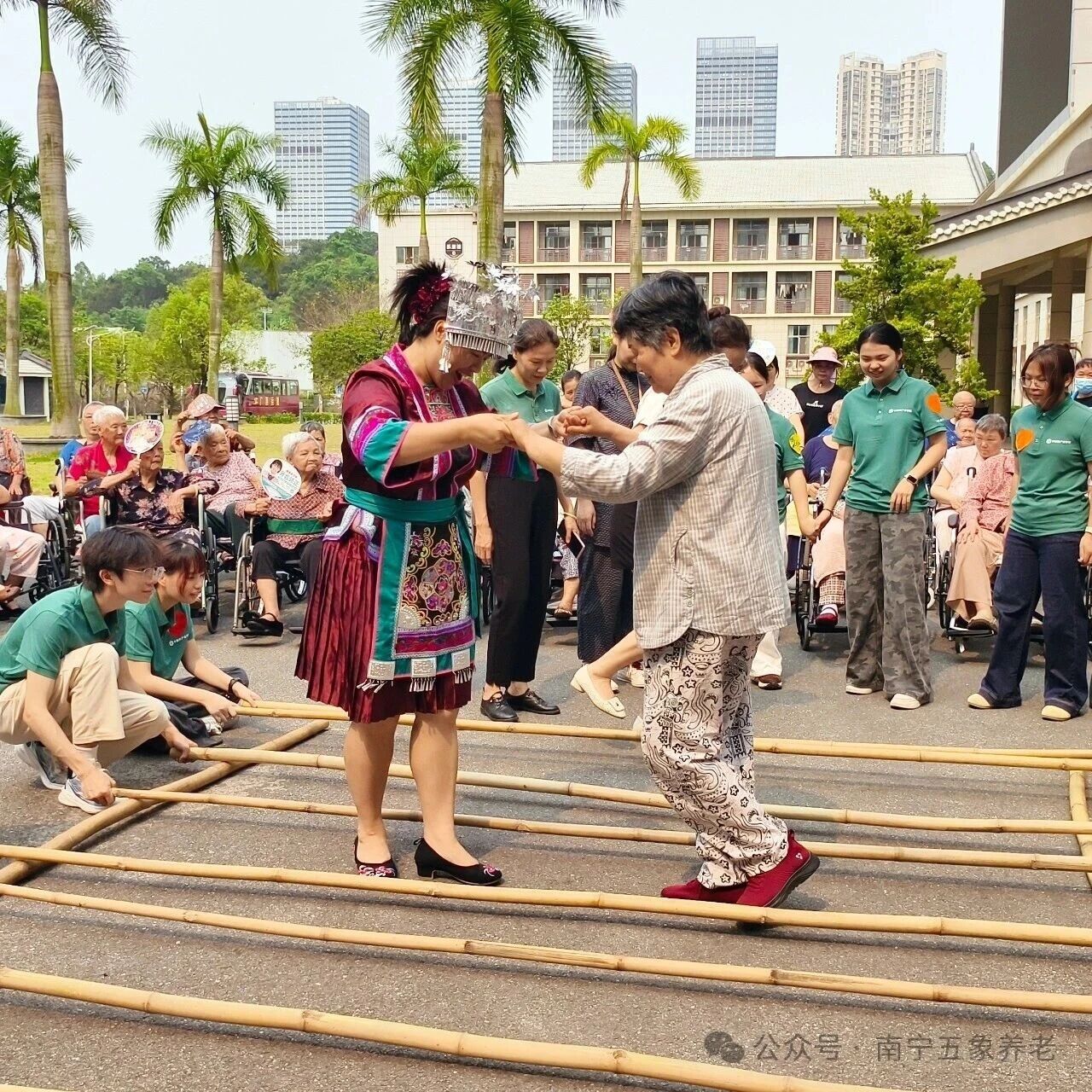 紧接着,竹竿舞开始了。志愿者们先做示范,随着竹竿有节奏地开合,他们轻快地跳进跳出。护士长们则搀扶着行动方便的长者,慢慢加入其中。竹竿“啪嗒啪嗒”的声响和大家的笑声混在一起,现场热闹极了。