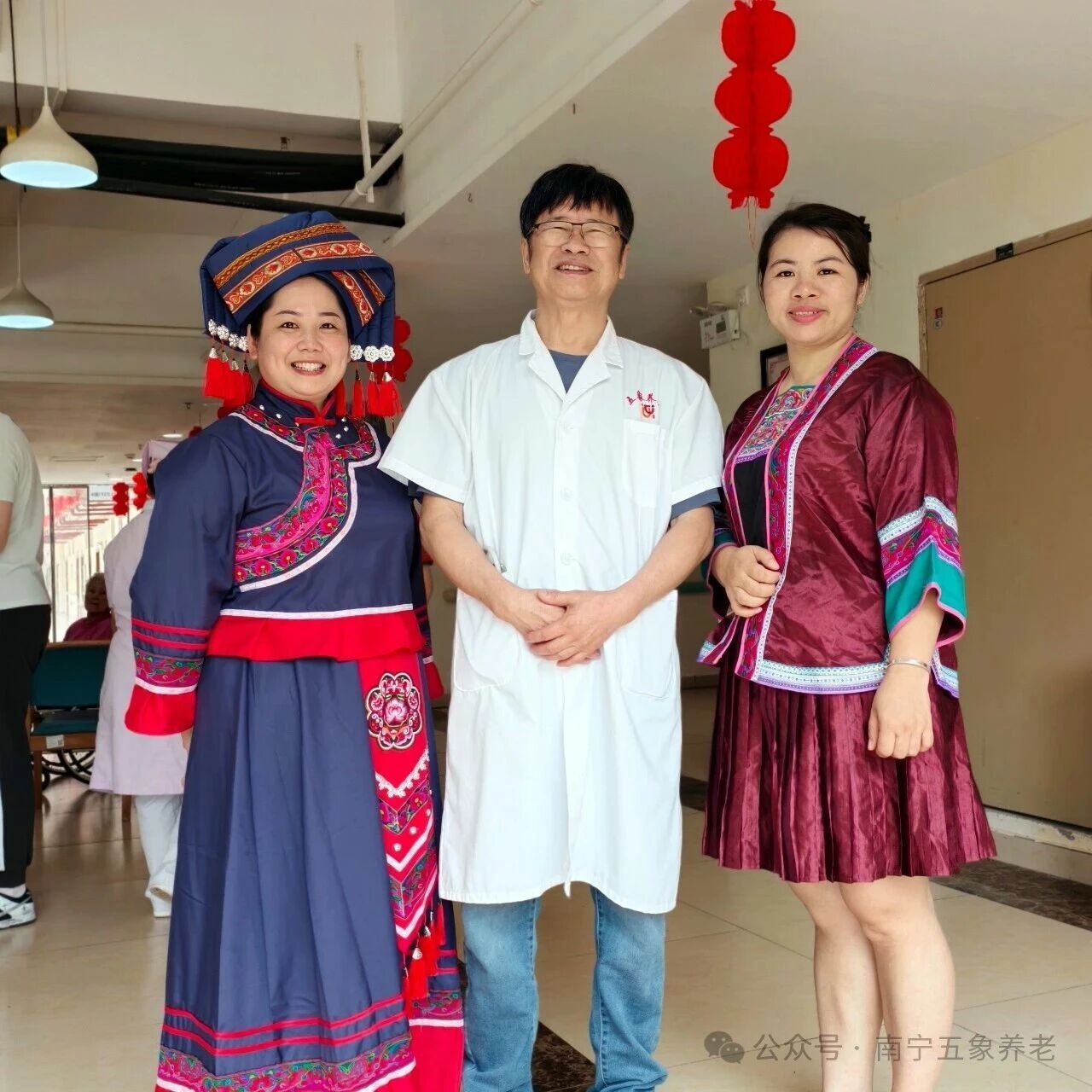 为了让节日氛围更浓,护士长们特意换上了民族服装。红、蓝、紫、绿,各色壮族服饰一亮相,顿时又增添了几分节日的氛围。庞声航主任笑着说:“穿上民族服装,大家更有过节的样子了。今天天气好,活动丰富,希望各位长者们玩得开心、吃得高兴。”