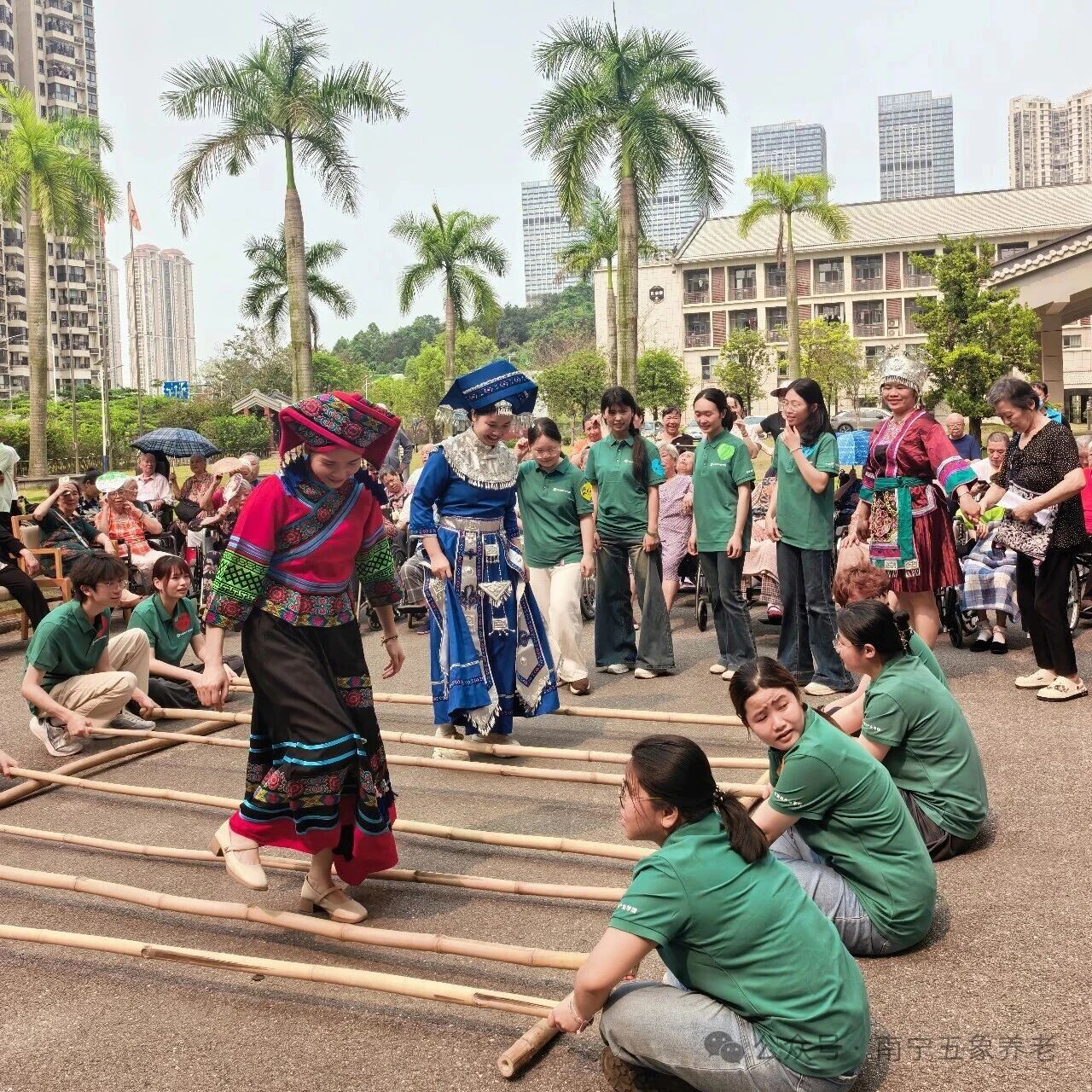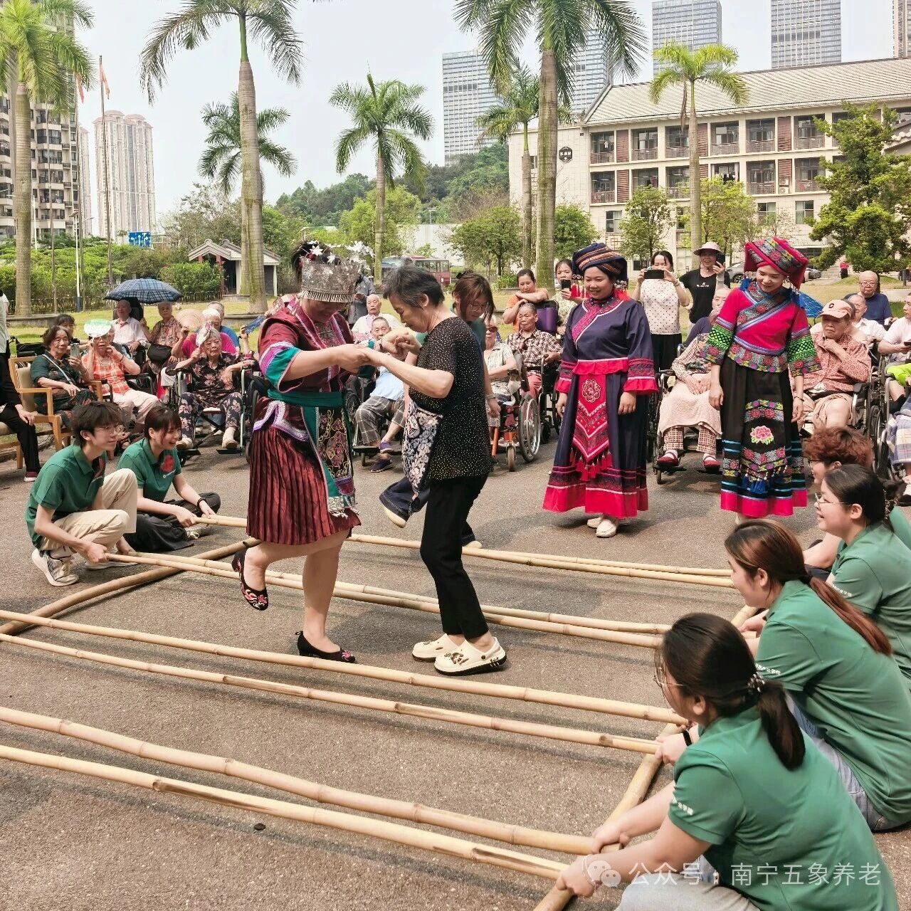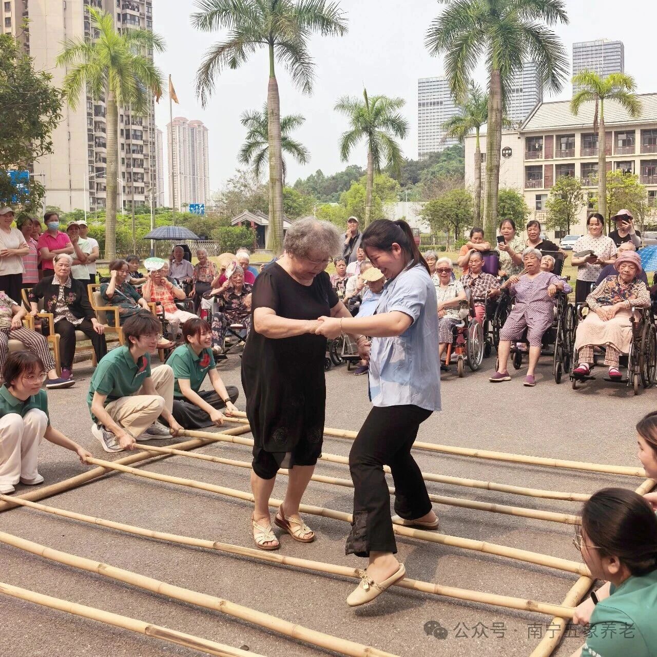 紧接着,竹竿舞开始了。志愿者们先做示范,随着竹竿有节奏地开合,他们轻快地跳进跳出。护士长们则搀扶着行动方便的长者,慢慢加入其中。竹竿“啪嗒啪嗒”的声响和大家的笑声混在一起,现场热闹极了。