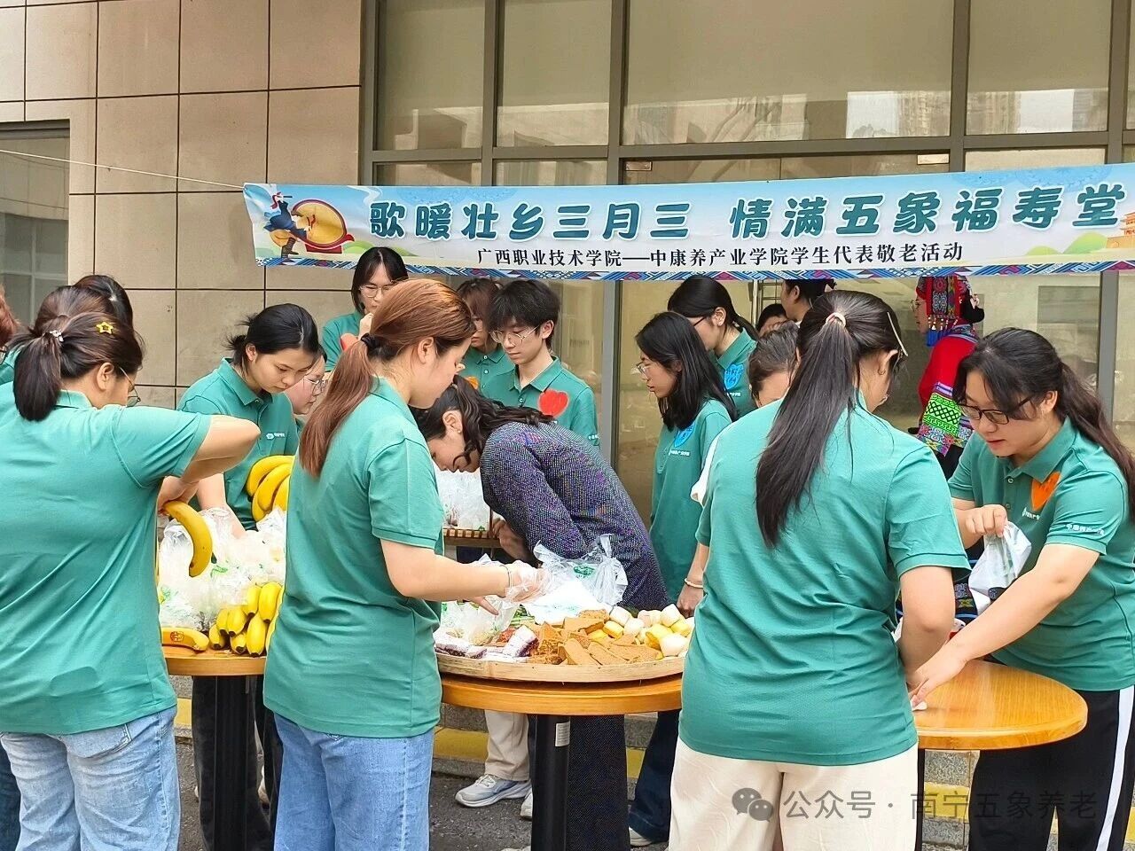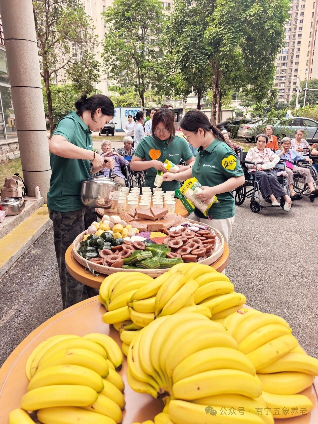 活动还没正式开始,花园里已经飘出了阵阵香味。社会爱心人士为长者们精心准备了丰富的壮乡美食:五色糯米饭、千层糕、艾粑、钵仔糕……长者们看到熟悉的食物,脸上露出了笑容。广西职业技术学院志愿者们也带来了香甜的水果和糕点,活动现场洋溢着温馨与喜悦。