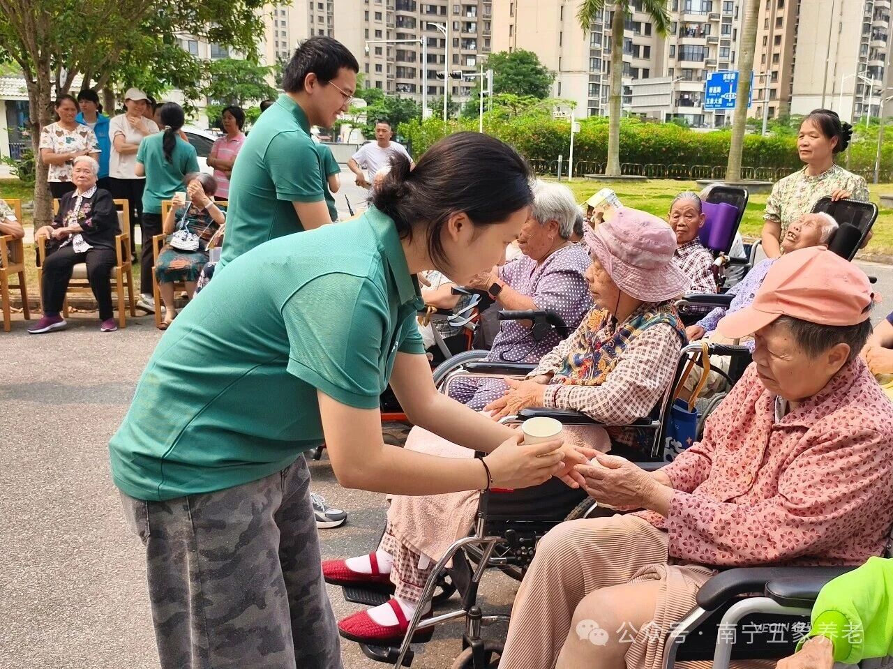 热闹过后,进入了美食分享环节。志愿者们把五色糯米饭、千层糕、艾粑、钵仔糕分装好,一一送到长者手中。品尝完美食,长者们在护理人员的照护下,心满意足地带着这份节日的快乐,边走边哼着山歌慢慢回到了自己“家”。热闹的花园渐渐恢复了宁静,但那些歌声和笑声,还留在暖暖的阳光里。